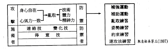 山本秀雄(1997)將柔道練習法分成:(一)護身打法、(二)練功法、(三)自由練習法、(四)站立練習、(五)順送練習、(六)比賽練習。另松本芳三(1994)也提出以下練習應用,其將施術者與防禦者身心與補強運動及柔道之連攻法詳細敘述如下表二所示: